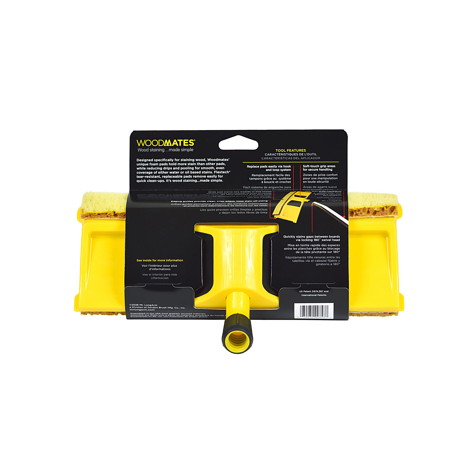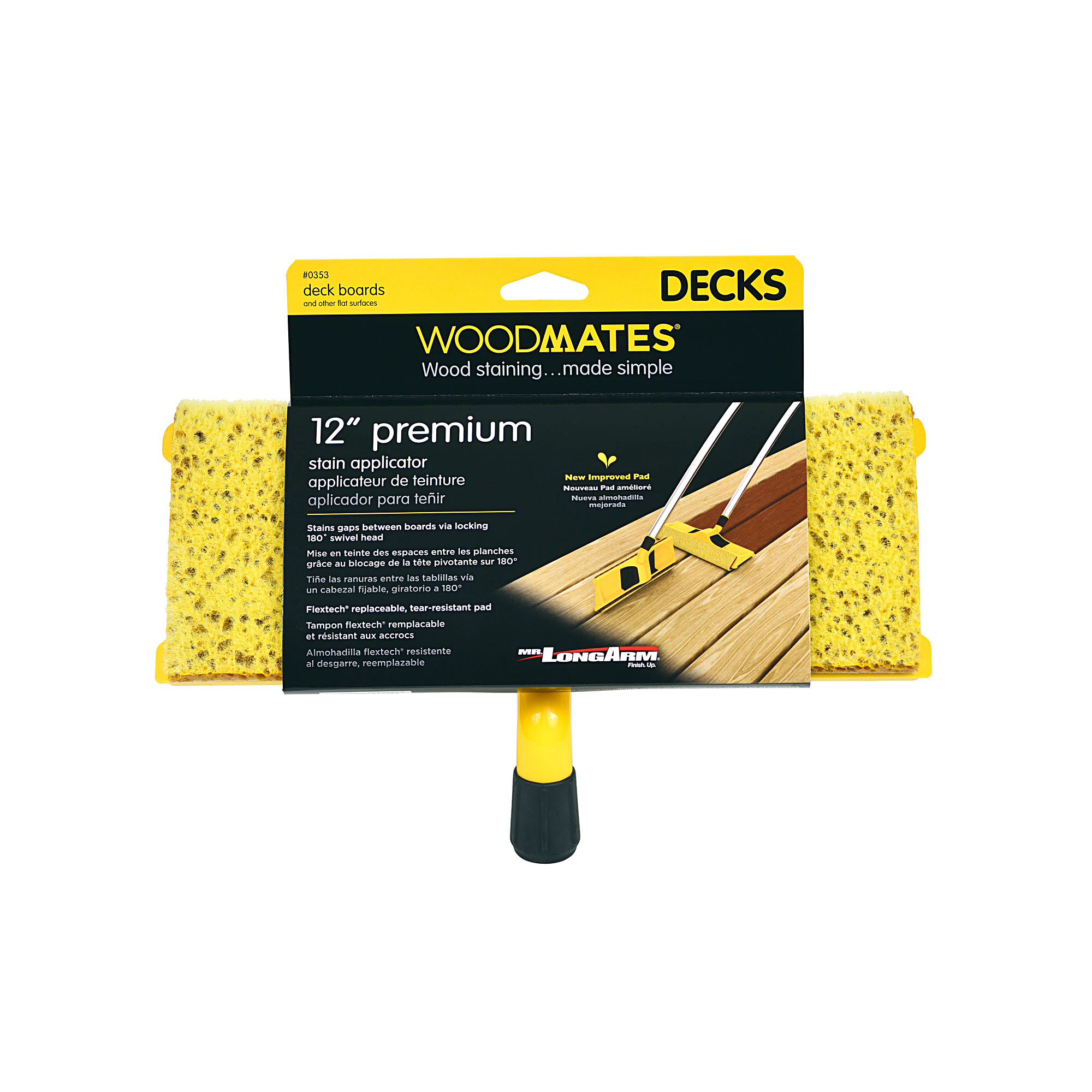 Mr. LongArm’s Woodmates® deck stain applicators have revolutionized deck staining. The innovative, award winning Woodmates® Staining Products provide everything you need to stain deck boards, balusters, rails and spindles. Woodmates takes the challenge out of maintaining outdoor living spaces that are such an important part of our homes. Proprietary Flextech® hygroscopic, tear-resistant foam pads hold and release more stain than other pads and help prevent dripping and pooling.